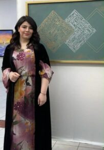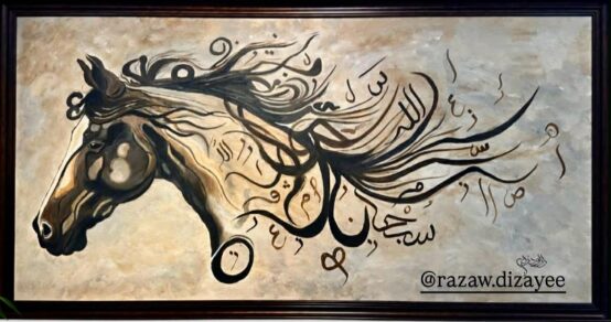 3. کاری سێیەم :کە شێوەیەکی ئەندازەیی گەورەی لە ناوەڕاستی کانڤاسەکەدا هەیە، لەگەڵ وردەکارییە ئاڵۆزەکانی خۆشنووسی کە لەناو ئەم شێوەیەدا جێگیرکراون. ئەم دیزاینە نیشان دەدات کە چۆن ئەندازەیی لەگەڵ جوانکاری خۆشنووسی تێکەڵ دەبێت.