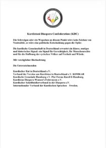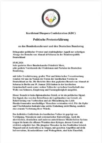 کۆمەڵەی فیدراسیۆنییە کوردستانییەکان لە وڵاتی ئەڵمانیا ئەمڕۆ ١٥⁄١⁄٢٠٢٦ یاداشنامەیەکی ناڕەزایی دەربڕینی ئاراستەی بەڕێزان ڕاوێژکاری ئەڵمانیا و سەرۆکی کوتلە سیاسییە و لایەنەکانی ئەڵمانیا کرد دژ بە سەردان و پێشوازی کردن لە ئەحمەد ئەلشەرع سەرۆکی دەسەڵاتی ڕاگوزەری سوریا بۆ ئەڵمانیا، ئەمەیش دەقی یاداشتنامەکەیە بە زمانەکانی ئەڵمانی و عارەبی؛